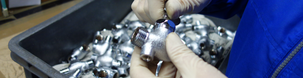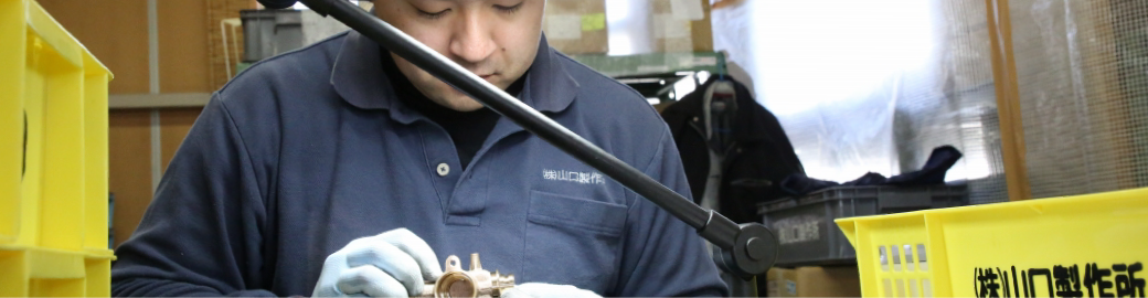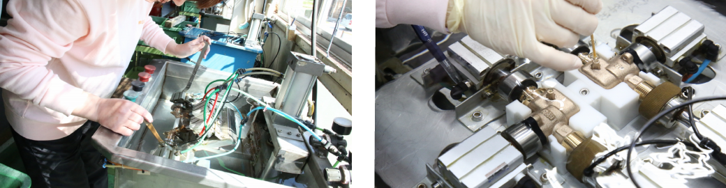 漏れが許されない水栓バルブなど、製品を水没させ、気泡を確認する目視検査を行っています。