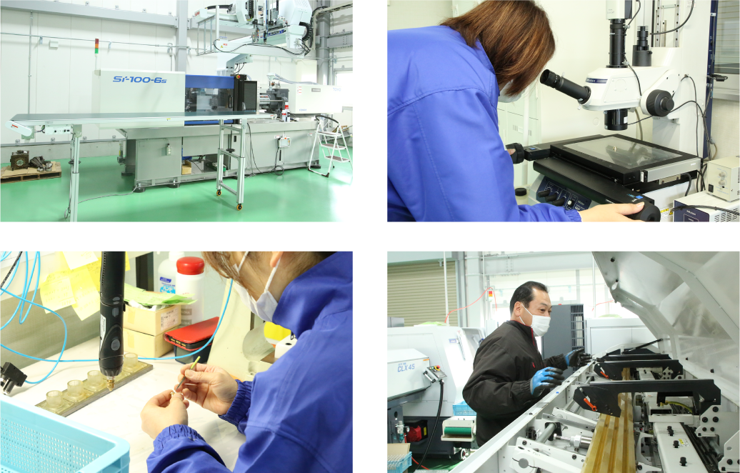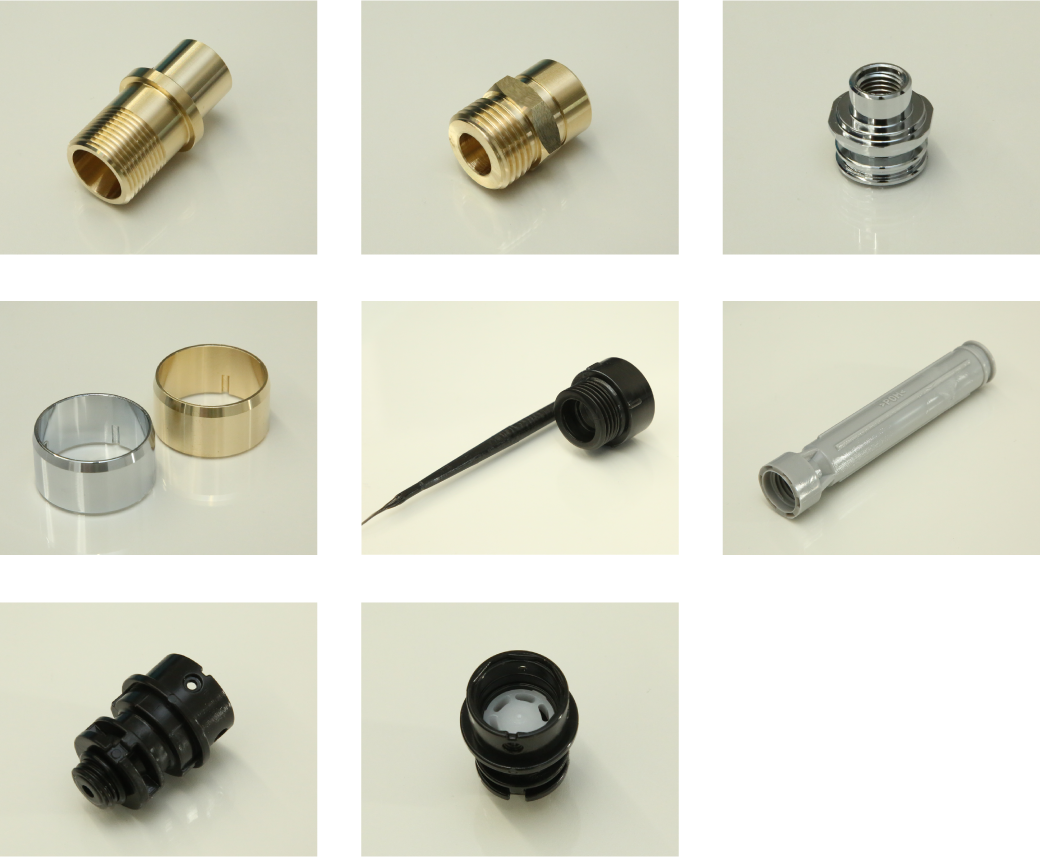 第二工場は、金属加工及びプラスチック成形、そして部品組付けを行う24時間稼働の工場です。鋳造工場で製造した水栓部品に組み付ける各部品の製造が主体で、CNS旋盤や射出成形機によって金属部品、プラスチック部品、共に加工を行います。加工した部品はそれぞれ組付けまで行い、水栓部品を上流工程から製品化まで自社一貫製造することでお客様の幅広いニーズにお応えいたします。